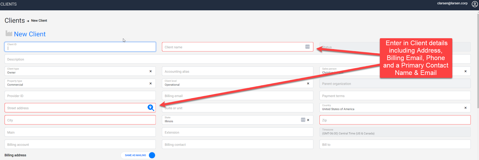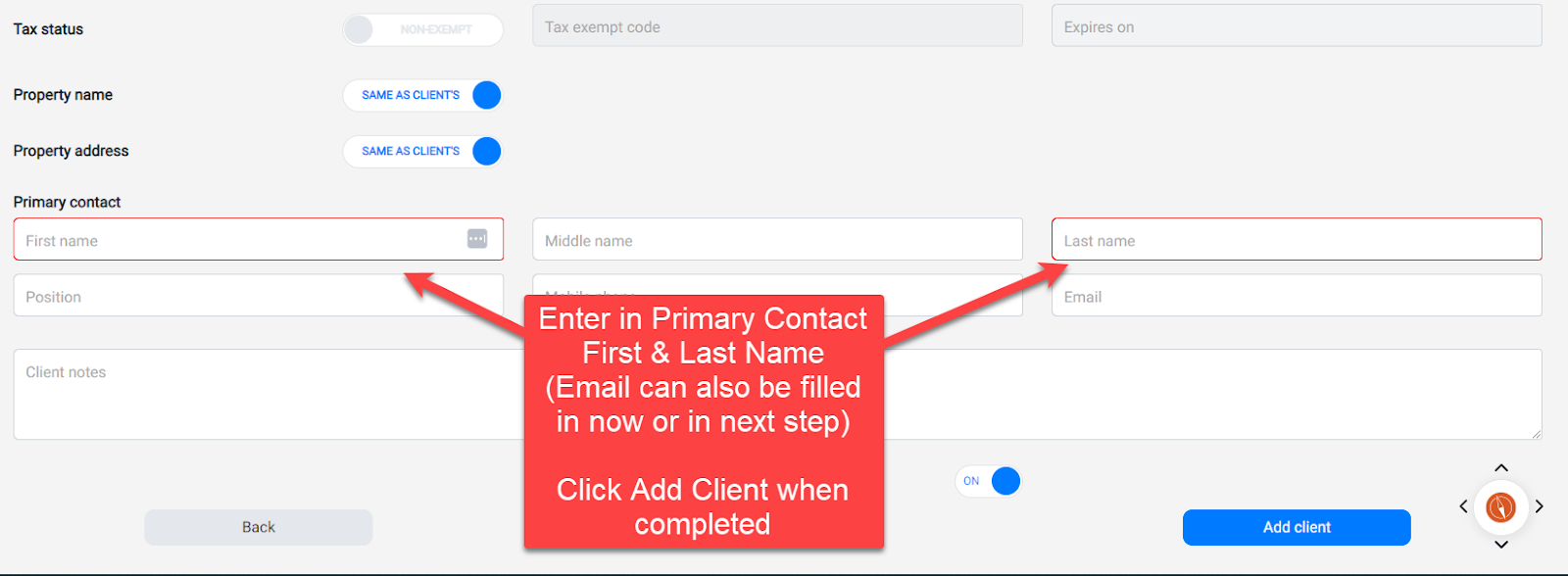 After creating the client, go to the Client Contact area and edit the Primary Contact details: