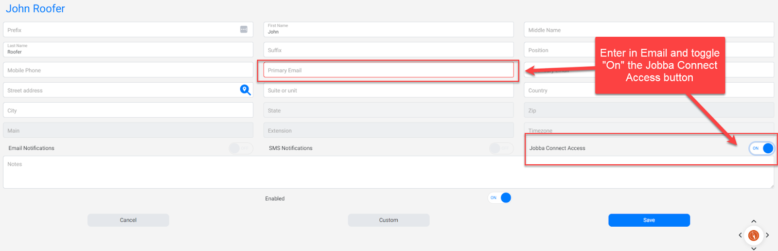 Add in Email plus Toggle the “Jobba Connect Access” button and click Save