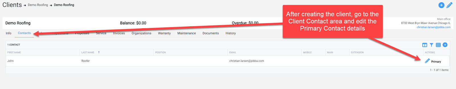 Enter in Client details including Address, Billing Email, Phone and a Primary Contact (Primary Contact is important for next step for sending an Invite to Jobba Connect) and click Add Client