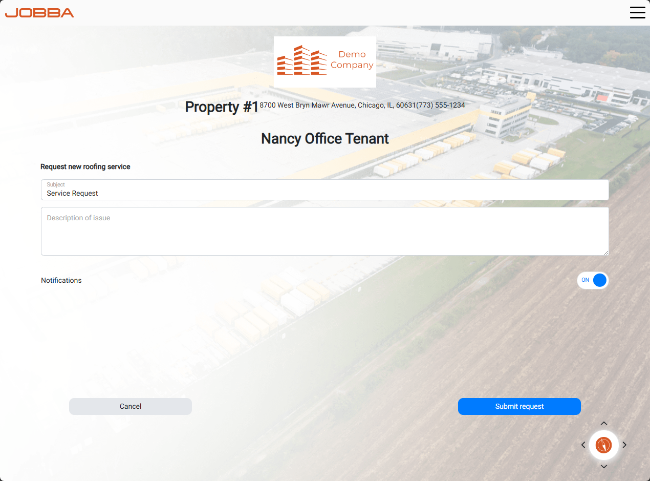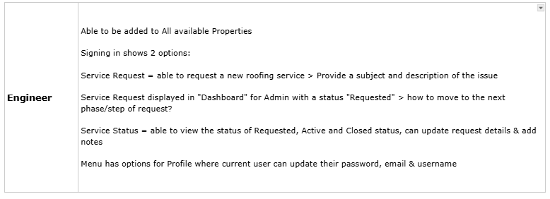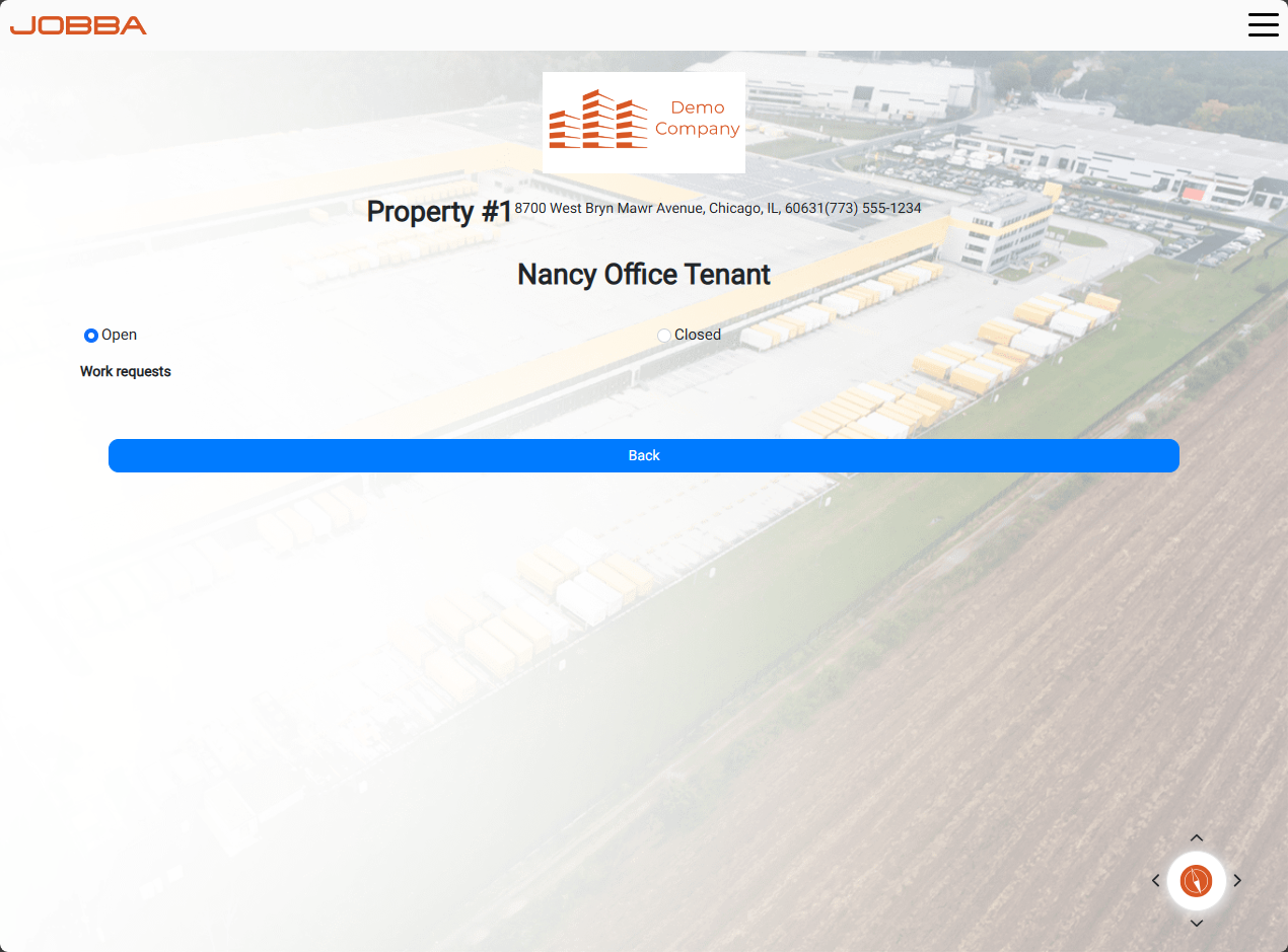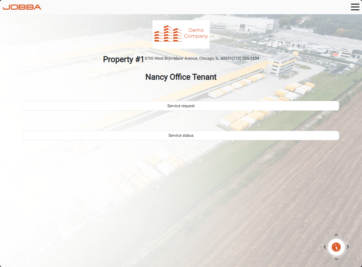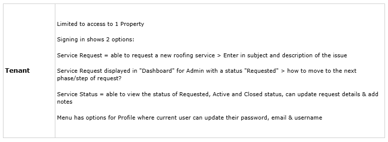 Tenant View - Limited to viewing only the Property the user account has been associated with. Can submit a Service Request or view the Service Status.