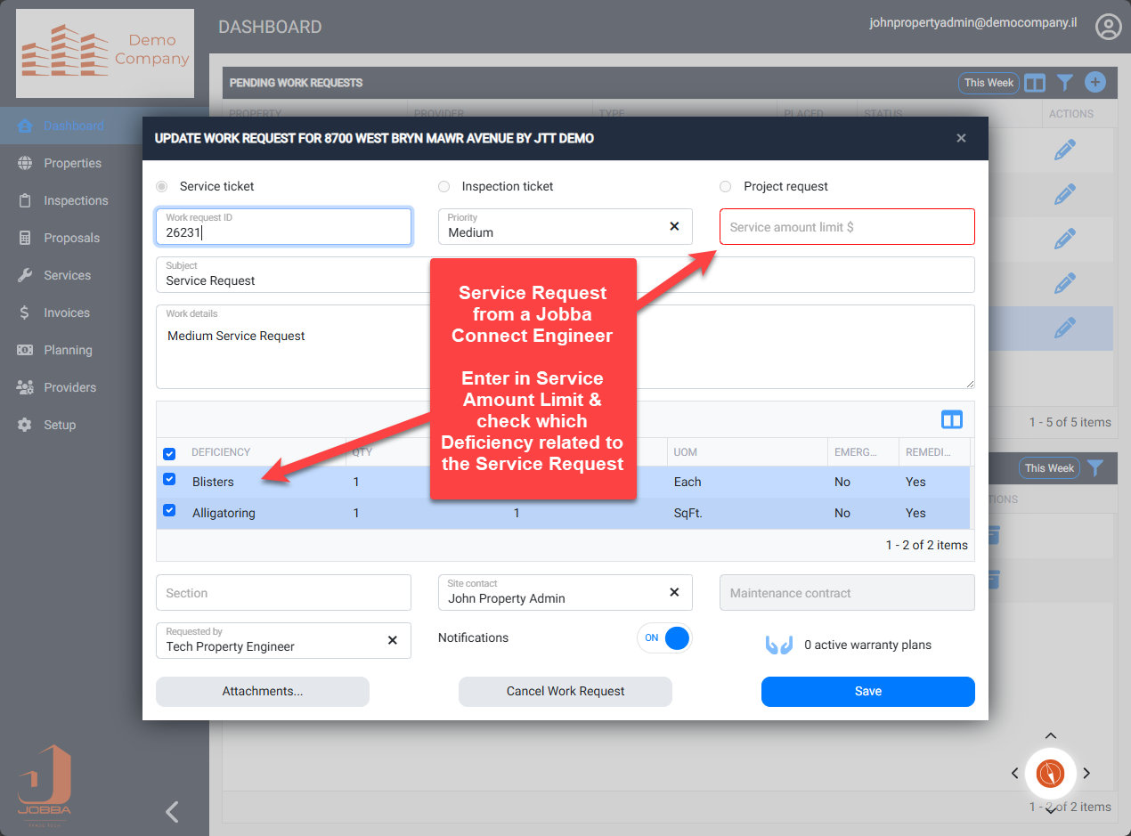 Engineer Request - In Jobba Connect, the Admin or Manager can review the Service Request and update the Service Amount Limit.